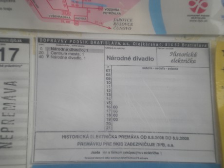 zastávky sú Národné Divadlo a Centrum Mesta(zastávky boli všetky po trase), Jazda len s pred zakúpeným lístkom v električke(bolo to ZADARMO) a že jazdí len so-ne a cez sviatky (jazdila deňne)